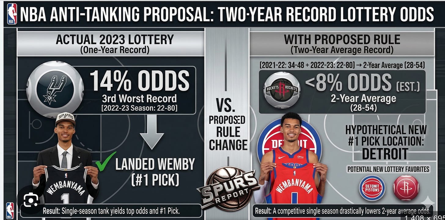 Teams with higher tanking scores would face real consequences: reduced lottery odds, or for the most egregious cases, exclusion from the top tier of the draft altogether. The specifics can be worked out. The principle is what matters: if you look like you’re tanking, you get penalized, and the penalty is severe enough to make tanking a genuinely bad strategy.